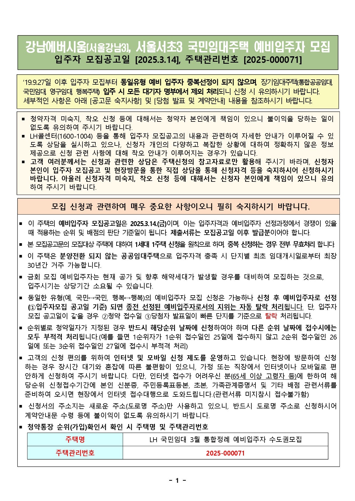 - 국민임대 및 행복주택 예비입주자 중복 보유 불가
